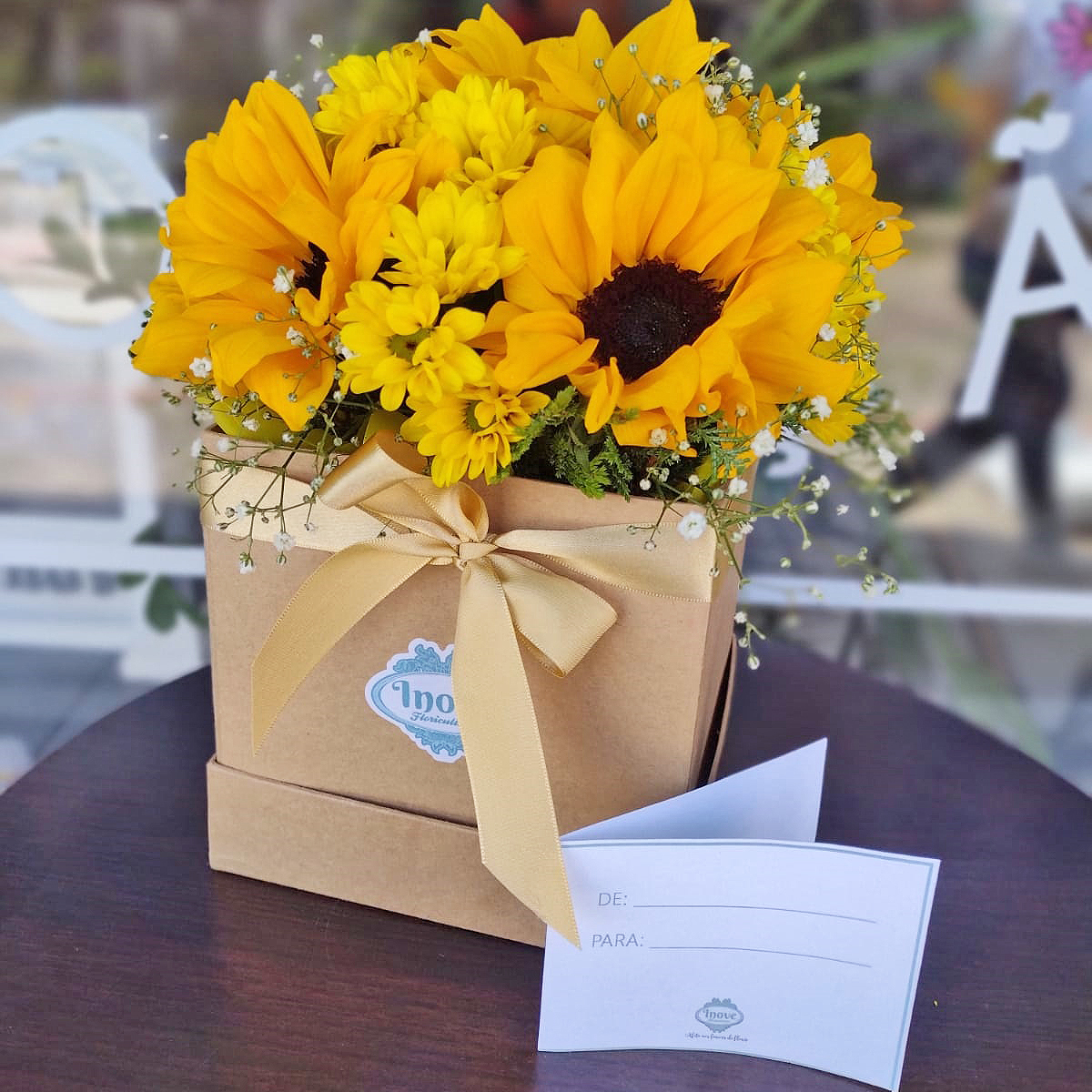 Essa charmosa caixinha reúne a beleza vibrante dos girassóis com o toque delicado das flores amarelas e do mosquitinho, finalizada com um laço elegante que realça ainda mais sua delicadeza.