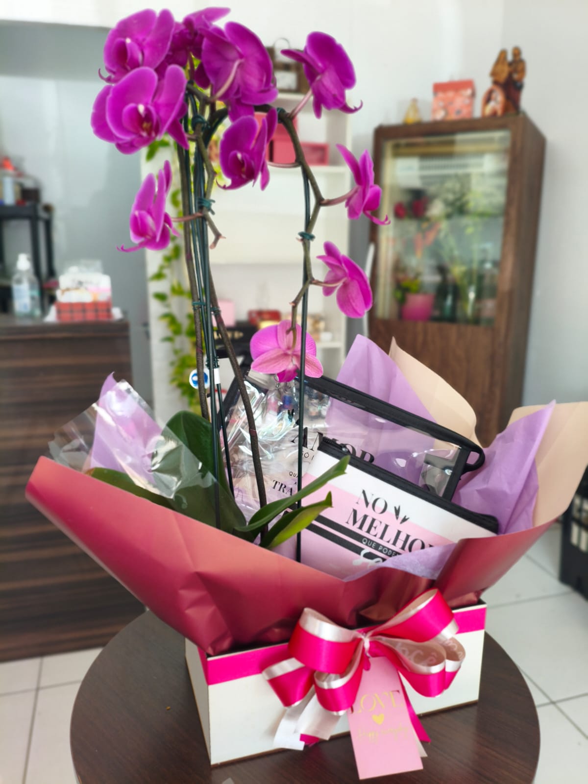 A Orquídea Amor Perfeito traz toda a elegância da phalaenopsis pink, acompanhada de um kit de necessaires temáticas de amor, tudo disposto com um laço duplo em tons de rosa e branco que deixa o visual ainda mais encantador.