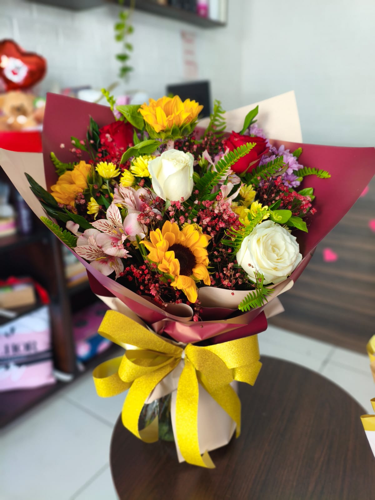 Um buquê vibrante e cheio de vida, com girassóis radiantes, rosas brancas delicadas, rosas vermelhas apaixonantes e um mix de flores coloridas que trazem alegria e sofisticação. Embalado em tons elegantes, finalizado com um laço luminoso, esse arranjo transmite energia, amor e positividade.